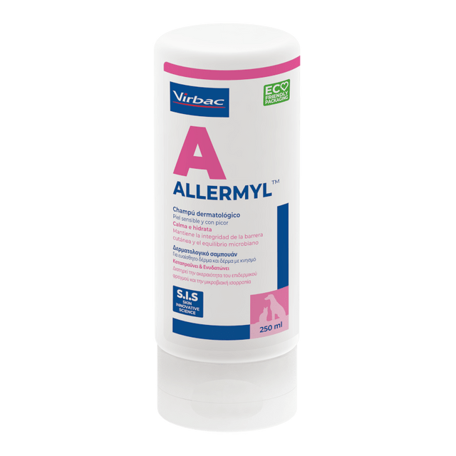 Allermyl® es un champú dermatológico suave, sin detergentes y óptima tolerancia, diseñado para un uso frecuente con el fin de optimizar el estado de la piel y el pelo de perros y gatos de todas las edades, con piel sensible y con picor. Allermyl® alivia la irritación, hidrata y mantiene la integridad de la barrera cutánea y el equilibrio microbiano natural de la piel. • Ayuda a mantener la integridad de la barrera cutánea, protegiéndola frente a agresiones externas.