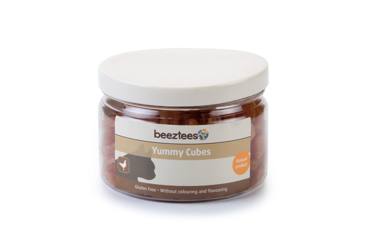 Los Beeztees Yummy Cubes son verdaderas golosinas para tu gato. Este producto natural contiene pollo, es libre de gluten y sin colorantes y sabores añadidos. Ideal como recompensa o como tentempié. Todo se mantiene fresco en el práctico y resellable contenedor.
