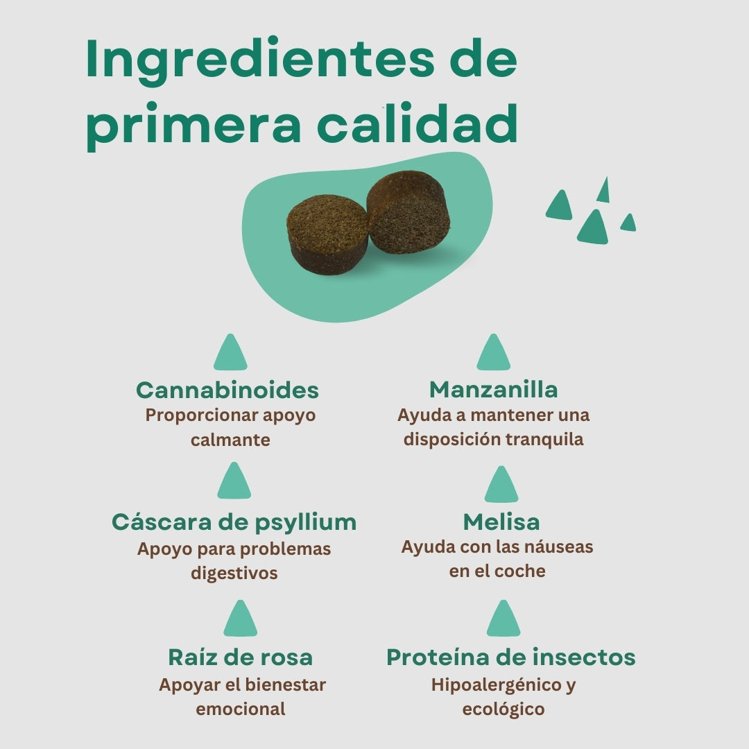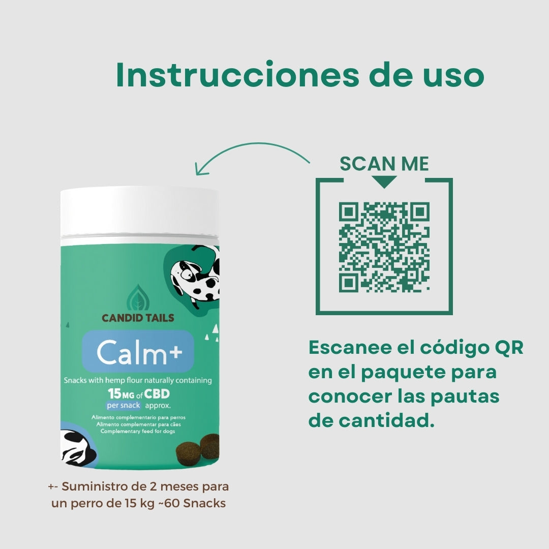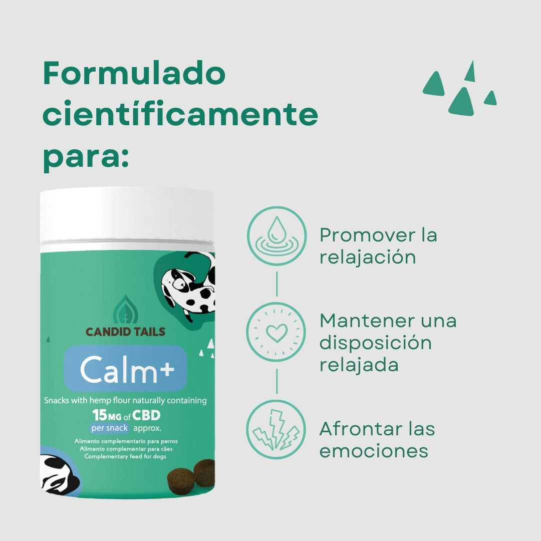 Calm+ se formuló cuidadosamente el snack de CBD funcional para ayudar a los perros a mantener un estado de calma durante los eventos emocionales. Útil para perros durante eventos de ruido fuertes, separación, paseos en automóvil, caminatas y otros eventos emocionantes.