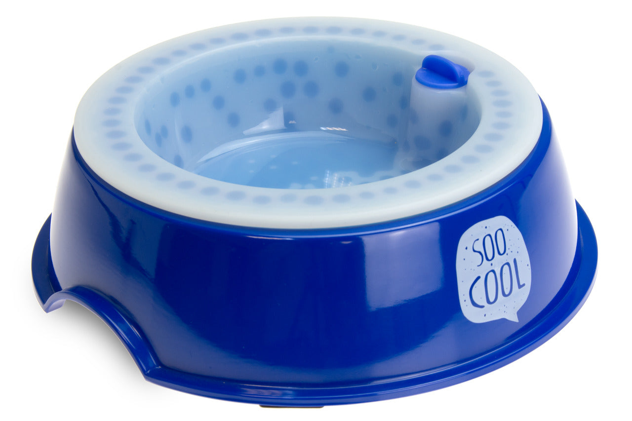 El cuenco de plástico azul con la impresión decorativa "SOO COOL" en un accesorio ideal para los cálidos días de verano. El inserto de enfriamiento en el recipiente está lleno de especiales bolas de gel . Para lograr el efecto de enfriamiento, este inserto se coloca en el refrigerador y luego se coloca dentro del tazón. Los alimentos o el agua permanecen agradablemente frescos y frescos. Por supuesto, en temperaturas menos cálidas, el recipiente de plástico también se puede usar sin un inserto de enfriamiento. Cuatro pies de goma planos aseguran la estabilidad y evitan que el cuenco se deslice.
