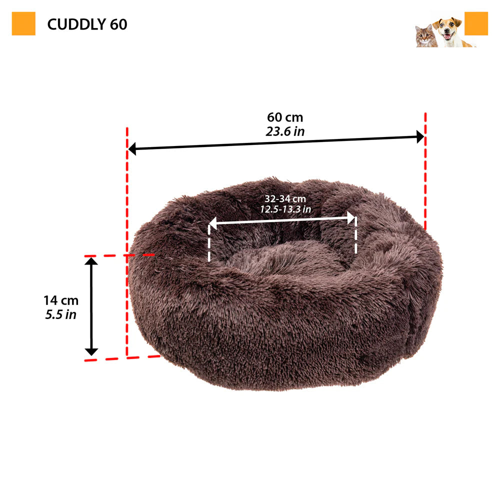 La cama Cuddly para perros y gatos asegurará dulces siestas para tu amigo en cualquier momento del día. El cojín, fabricado en pelo ecológico cálido y extrasuave, muy confortable, está diseñado para ofrecer una mayor protección especialmente durante los meses de invierno. Cuenta con acolchado grueso y un borde alto para ofrecer soporte para la cabeza y el cuello. La forma redonda de donut envuelve a tu perro o gato y le permite acurrucarse en su interior, brindándole protección y seguridad al animal, convirtiéndose así también en un útil antiestrés.
