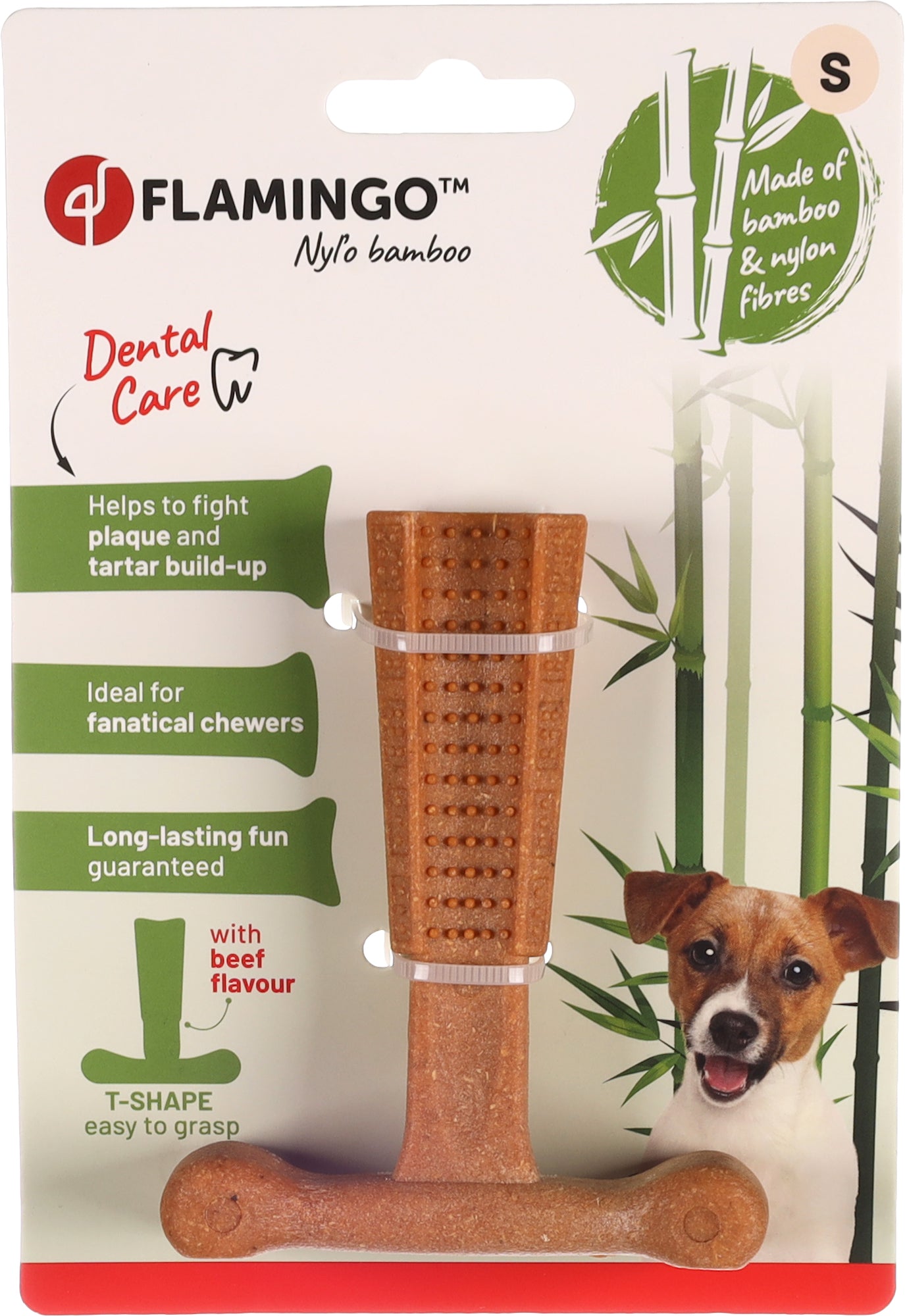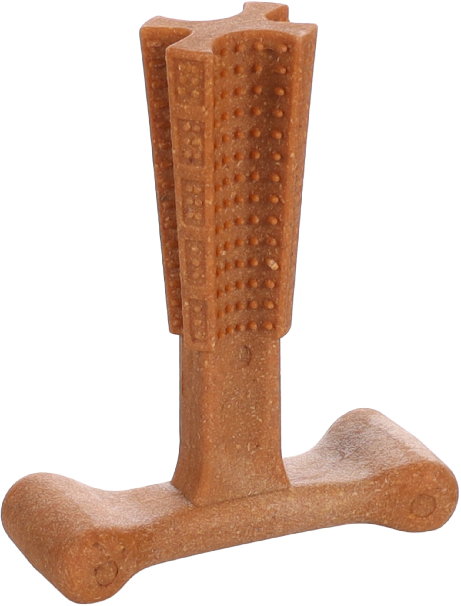 Este juguete para perros Nylo Bamboo T-Bone está hecho de bambú y nylon. Tiene un delicioso sabor a carne de res y ayuda a prevenir la placa dental y masajear las encías. ¡Perfecto para masticadores entusiastas!