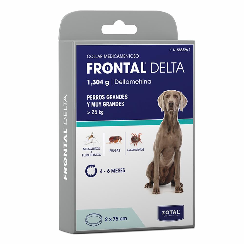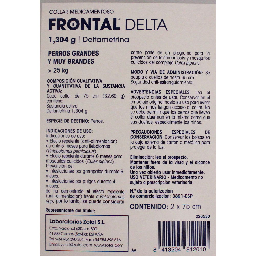 El Collar FRONTAL DELTA posee efecto repelente (anti-alimentación) frente a flebotomos (Phlebotomus perniciosus) y mosquitos culícidos (Culex pipiens) durante 5 y 6 meses; por lo que se puede considerar como parte de un programa para la prevención de leishmaniosis y mosquitos culícidos del complejo Culex pipiens. Indicado además para la prevención de las infestaciones producidas por garrapatas y pulgas durante 6 y 4 meses.