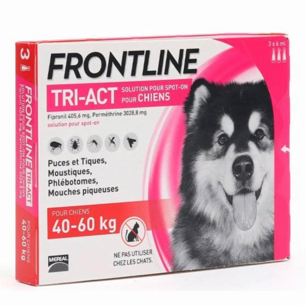 Frontline Tri-act pipetas actúan contra pulgas, garrapatas, flebotomos, mosquitos y piojos picadores, en perros de 40 a 60 kg de peso.