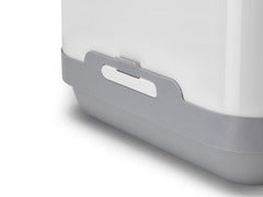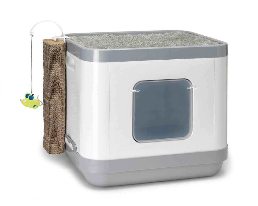 Arenero, litera y área de juegos en uno. El Cube II versátil está hecho de plástico belga de alta calidad. Probablemente único en diseño y forma, esta caja de arena también tiene una superficie en el techo, una placa para rascar y un juguete en el costado. El alcance de la entrega también incluye una cuchara de arena y un filtro de carbón activado.