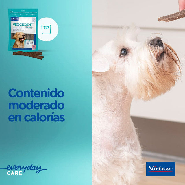 Veggiedent FR3SH es un snack dental de uso diario que combate las causas del mal aliento y asegura la higiene bucodental contra la placa dental y el sarro de tu perro. La alta calidad del producto, el olor agradable, su composición natural y saludable, y la gama de tamaños adaptable a cada perro lo hacen el producto perfecto para la limpieza bucal diaria de tu mascota.