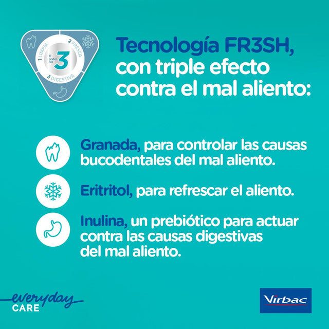 Contiene la innovadora tecnología FR3SH que actúa contra las causas del mal aliento a 3 niveles:
