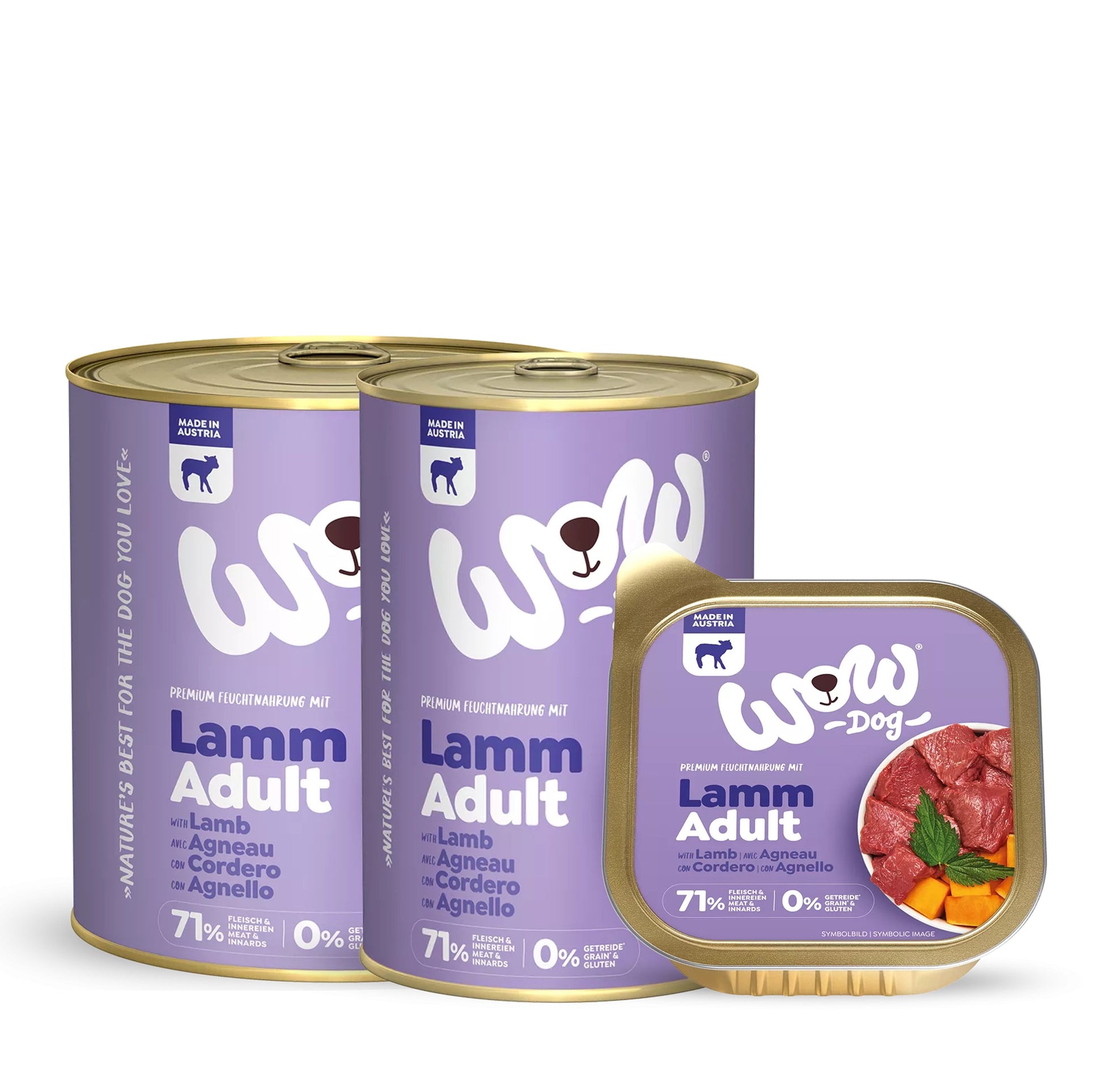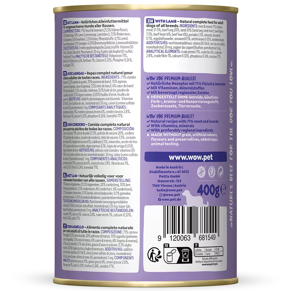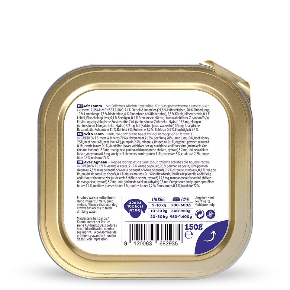 Adulto Cordero con calabaza | Composición: carne y vísceras 71 % (carne de pollo 21,5 %, pulmón de vacuno 20 %, pulmón de cordero 10 %, riñón de vacuno 7,5 %, corazón de vacuno 6 %, hígado de vacuno 6 %), calabaza 2,5 %, minerales, aceite de lino 0,1 %, cáscara de huevo molida, algas marinas 0,1 %, hojas de ortiga 0,1 %, hojas de diente de león. | Sin gluten, azúcares añadidos, soja, harina de huesos, despojos, colorantes, aromatizantes, conservantes, potenciadores del sabor. | Elaborado sin experimentación animal ni manipulación genética.