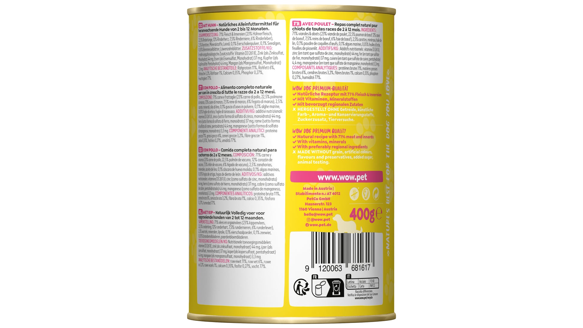 Puppy pollo con zanahorias y ortiga | Composición: 71 % carne y vísceras ( 23 % carne de pollo, 22,5 % pulmón de vacuno, 12 % corazón de vacuno, 7,5 % riñón de vacuno, 6 % hígado de vacuno), 2,5 % zanahorias, minerales, aceite de lino, 0,1 % cáscara de huevo molida, 0,1 % algas marinas, 0,05 % hojas de ortiga, hojas de diente de león. | Sin gluten, azúcares añadidos, soja, harina de huesos, despojos, colorantes, aromatizantes, conservantes, potenciadores del sabor. | Elaborado sin experimentación animal ni manipulación genética.